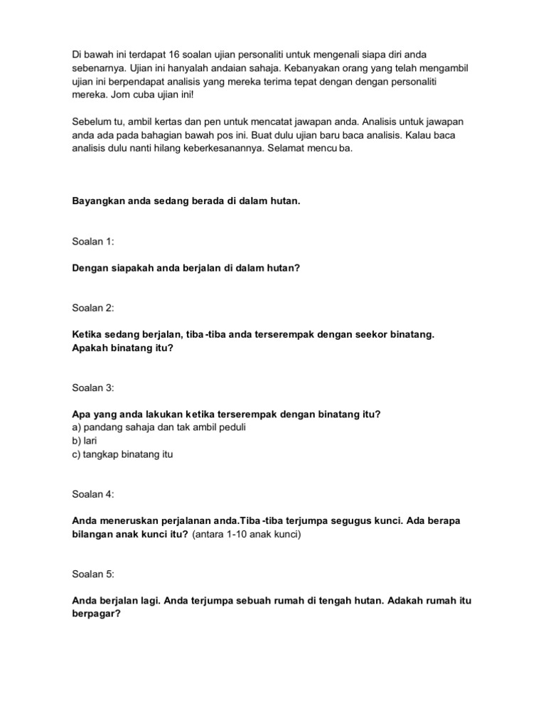 Ujian ini bertujuan untuk mencari kecenderungan paling semula jadi anda. Eksplorasi potensi diri melalui ujian. Jawaban yang kamu pilih mencerminkan karaktermu. >> nombor tarikh lahir anda yang tersembunyi, mengenalpasti nombor tersembunyi diri anda. Setiap orang mempunyai personaliti yang tersendiri dan keperibadian itu dikatakan terdiri daripada beberapa gabungan ciri unik yang ada pada setiap individu itu yang mendedahkan bagaimana keperibadian mereka yang sebenarnya.
